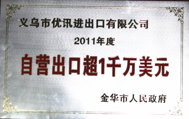 賽爾網訊 2012年8月1號,金華市人民政府為義烏優訊進出口有限公司頒發“2011年度自營出口超1千萬美元”榮譽牌匾。