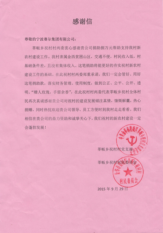 幫助祝村修路,只是近年來我集團(tuán)履行社會(huì)責(zé)任的一個(gè)側(cè)面,也是集團(tuán)“賽爾愛農(nóng)”慈善基金的最新項(xiàng)目,近年來,“賽爾愛農(nóng)”項(xiàng)目已捐助貴州、麗水、奉化等多地農(nóng)村的老年活動(dòng)中心、希望小學(xué)、村級(jí)道路等多個(gè)基礎(chǔ)設(shè)施項(xiàng)目,累計(jì)捐款近400萬元。