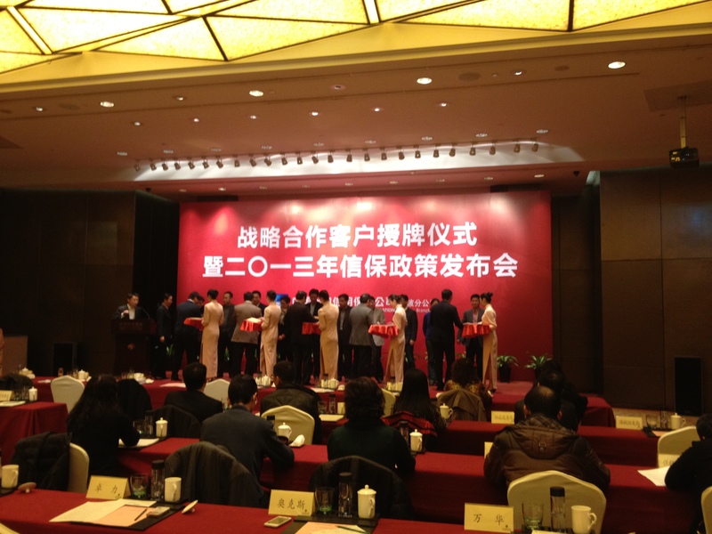 1月17日下午,中信保寧波公司戰(zhàn)略合作客戶授牌儀式暨2013年信保政策發(fā)布會在南苑環(huán)球酒店舉行,市政府各有關(guān)部門、各區(qū)縣外經(jīng)貿(mào)主管部門以及50家中信保寧波2012年戰(zhàn)略合作大客戶代表出席,我司應(yīng)邀參加授牌儀式。