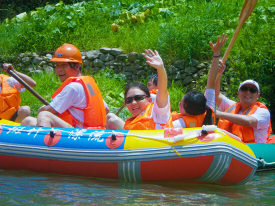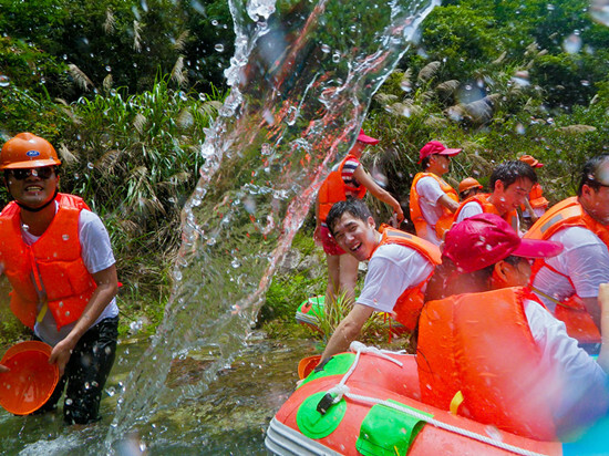 清涼水花飛濺引來女生們的聲聲尖叫,男生們則吼著嗓子大喊爽快。崎嶇的漂流水道驚險刺激,橡皮船橫沖直撞,險些卡在突起的石塊中間,很快就被后續飛沖下來的橡皮船撞開,猶如一場激烈的水上碰碰車大戰。每到一個水流平穩的地方,部分男同事棄船蹲點,準備好滿滿的水,等待著被水流沖下來的同事展開密集的潑水攻勢,女生們力氣不敵男生最終敗下陣來舉白旗投降,有些男同事奮起對戰猛烈潑水,卻也因寡不敵眾輸得慘烈。