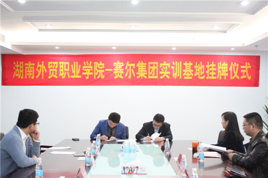 賽爾網(wǎng)訊 4月24日上午,我集團與湖南外貿(mào)職業(yè)技術(shù)學(xué)院簽署校企合作協(xié)議,舉行校外實訓(xùn)基地和就業(yè)實習(xí)基地授牌儀式。學(xué)院黨委書記屈孝初、院長唐瑾及相關(guān)老師,我集團總裁助理喻進,業(yè)務(wù)總監(jiān)陳朝輝、韓科,行政副總監(jiān)龔江民等,參加了此次簽約儀式。