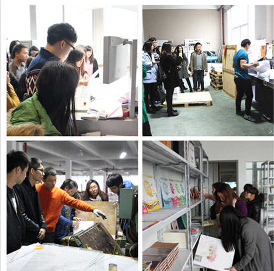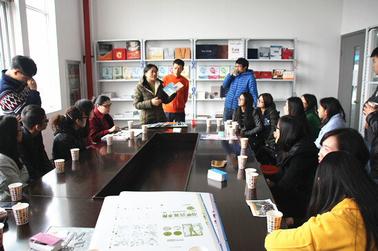 在暢意印刷有限公司負責人王東明、魏麗鋒的帶領下,大家首先參觀了印刷車間,實地察看了大型印刷、燙金和切割設備的工作過程,公司負責人王總現場為大家介紹了包裝印刷的基本知識。隨后,在印刷公司樣品室,公司負責人魏總向大家介紹了吊牌、紙卡、不干膠、包裝袋、說明書、樣本冊等相關印刷流程和工藝,同時介紹了包裝紙張的分類、特點及用途選擇、紙張色彩識別技巧等專業知識,并不時解答現場提出的問題。