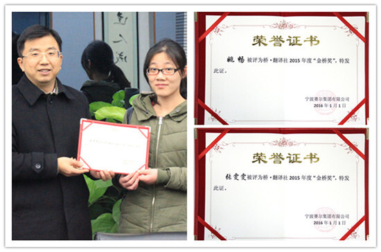 會(huì)議最后,為表彰張?chǎng)┖鸵硟晌簧鐔T在集團(tuán)外語(yǔ)培訓(xùn)上所作出的貢獻(xiàn),特向她們頒發(fā)了“金橋獎(jiǎng)”榮譽(yù)證書,今后,“金橋獎(jiǎng)”將成為表彰翻譯社內(nèi)有突出貢獻(xiàn)社員的常設(shè)榮譽(yù)獎(jiǎng)項(xiàng)。