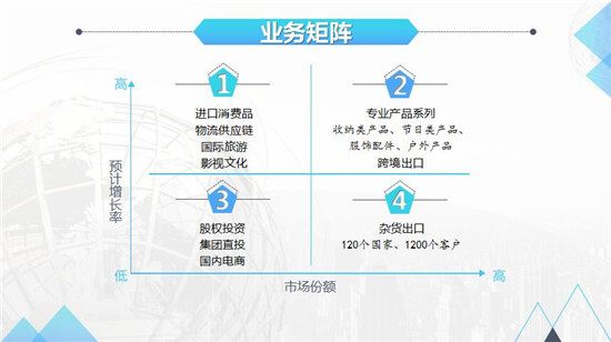 徐總表示,2017年經(jīng)濟(jì)雖然面臨一些不確定因素,但當(dāng)今世界已經(jīng)充分全球化,大國之間的經(jīng)貿(mào)合作你中有我我中有你,很難出現(xiàn)全面的貿(mào)易戰(zhàn)爭,國際市場仍有很多機(jī)會。集團(tuán)各公司在綜合分析新老市場和新老客戶訂單等要素后,主動提出了不低于15%的年度增長目標(biāo),一些新生業(yè)務(wù)板塊增長目標(biāo)更高,這些讓他也倍感鼓舞。當(dāng)前集團(tuán)業(yè)務(wù)矩陣布局合理,其中日用消費(fèi)品出口市場遍布120多個國家(地區(qū))擁有1200余重要客戶,業(yè)務(wù)發(fā)展比較穩(wěn)定;精心挑選、深入打造的十余個專業(yè)產(chǎn)品系列已經(jīng)形成較強(qiáng)的競爭力,跨境電商出口額連續(xù)兩年成倍增長,2017年出口額有望超過4000萬美元,這些都是集團(tuán)未來非常重要的增長極;集團(tuán)近年來相繼投資了消費(fèi)品進(jìn)口供應(yīng)鏈、國際物流、定制旅游、影視文化等項(xiàng)目,也將是集團(tuán)今后非線性增長邏輯的潛力項(xiàng)目;集團(tuán)參與了多個股權(quán)投資基金,同時將深入研究和做外貿(mào)關(guān)聯(lián)的項(xiàng)目直投,并且也考慮自己探索有競爭力產(chǎn)品的國內(nèi)電商等業(yè)務(wù),這些都是集團(tuán)業(yè)務(wù)矩陣的豐富與補(bǔ)充。今后,集團(tuán)將繼續(xù)聚焦外貿(mào)主業(yè),重視客戶價值,平衡業(yè)務(wù)邊界,在重視專業(yè)化的同時,也要打破行業(yè)邊界,積極構(gòu)建“外貿(mào)+”生態(tài)圈,以實(shí)現(xiàn)未來繼續(xù)取得健康有機(jī)的公司發(fā)展。