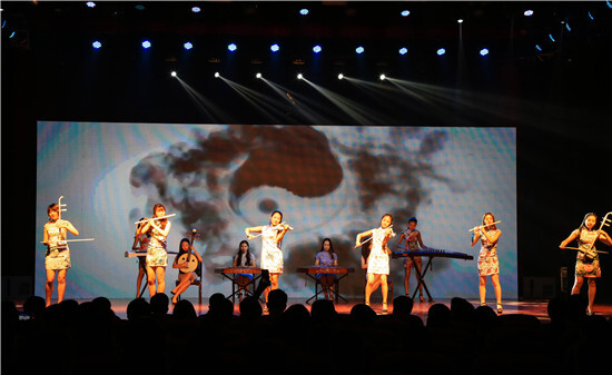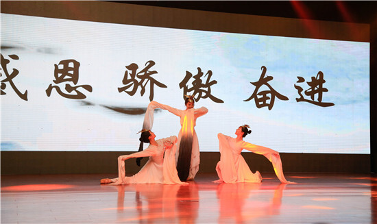 在清揚柔美的墨舞中,文藝匯演正式拉開帷幕。三名舞者用剛柔并濟的舞姿緩緩書寫出“感恩、驕傲、奮進”的字眼,一亮相便驚艷全場。