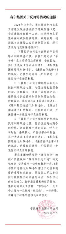 賽爾集團反舞弊通報