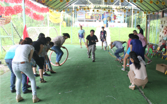 9:20分我們到達開心谷活動場地,在游戲教練的帶領下合影后開始活動熱身,抱團游戲,孩子和家長在一片歡聲笑中很快進入游戲狀態(tài)。我們正式開始第一個互動游戲:破冰起航,家長們報數(shù),重建團隊,通過思想動員,孩子們報隊名、口號,唱隊歌;隊歌不夠響亮的團隊將接受懲罰。第一回合藍隊由于人數(shù)少隊歌嘹亮而旗開得勝。紅隊雖受懲罰,但沒有氣餒,后面的游戲再接再厲,爭取贏得勝利。