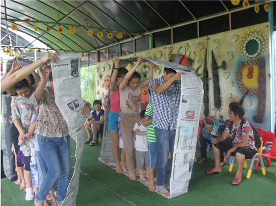 親子拔河比賽,把整個游戲推向高潮,各位辣爸靚媽們帶領自己的孩子使出渾身解數(shù),力圖把對方拉到自己的陣營,三局兩勝,我們的紅隊最后獲勝。