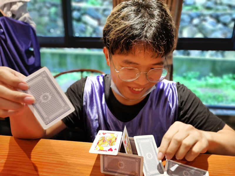 盡管天公不作美,卻絲毫沒有影響大家的心情。入住別墅稍事休息后,吹乒乓球、疊紙牌和猜紙卡的小游戲開始點燃了大家的勝負欲。