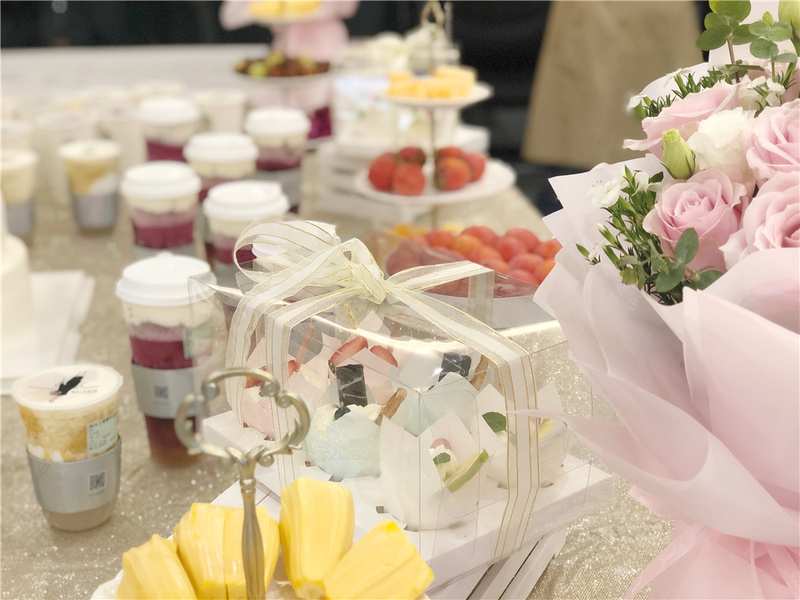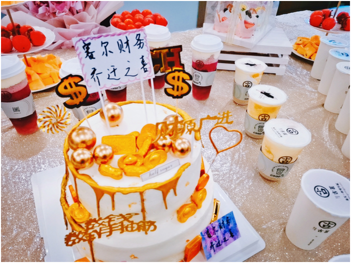 10月27日下午,賽爾大樓25層財務會議室里,正熱火朝天地舉行著喬遷小party。C位留給白金色雙層大蛋糕,用幾十杯不同口味的奶茶和果飲圍著蛋糕擺出完美的愛心,另有漂亮淡雅的溫柔系粉色鮮花、綁著金絲帶的甜品禮盒助陣,再添上各色水果,看得人眼花繚亂。彩姐和吳穎姐一起切完蛋糕后,小伙伴們正式開啟嗨吃模式。