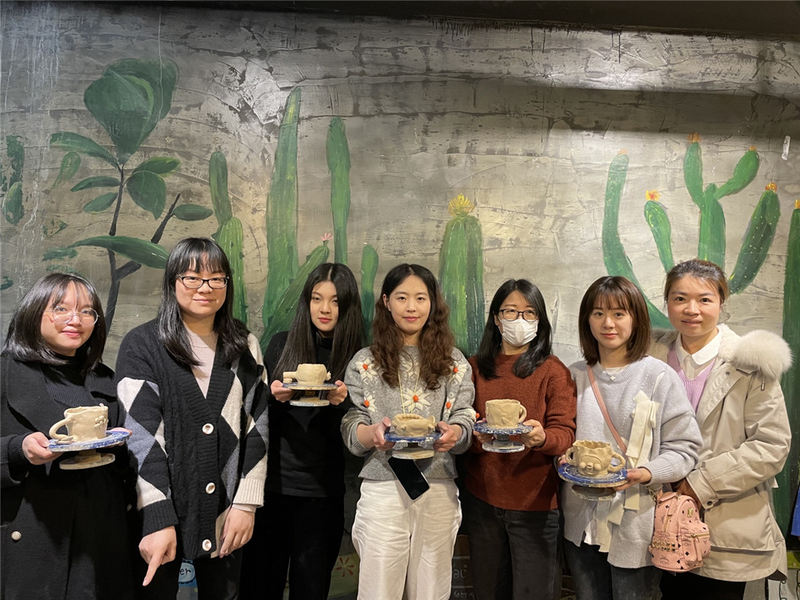 當(dāng)天中午,大家約在鼓樓的“桃妝”吃飯,這是一家老網(wǎng)紅,菜色和環(huán)境都很不錯。最有特色的就是桃花酒啦,很值得一品,我們豪氣地一人來了一碗,干杯!午餐結(jié)束后則是最期待的陶藝DIY時間。大家各自選好想要制作的作品,開始埋頭認(rèn)真制作。大家都是第一次做陶藝,手藝生疏得很,還好有老師指點,做出來的作品也都富有特色。